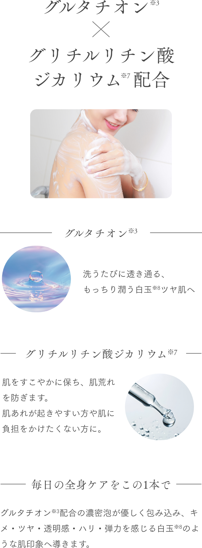 洗うほどに、角質層のすみずみまで潤いを与えるとともに、ふっくらと弾力感を高めます。